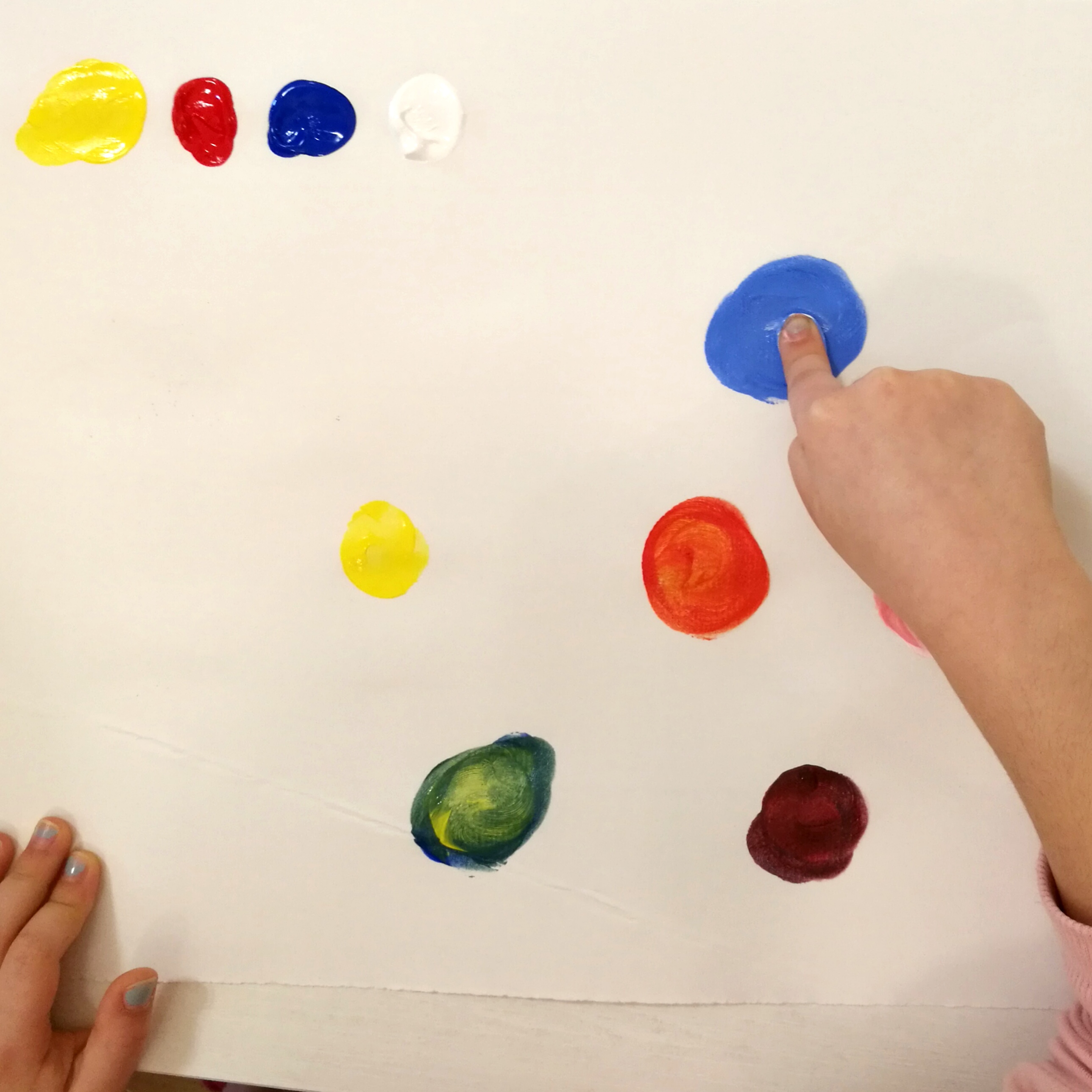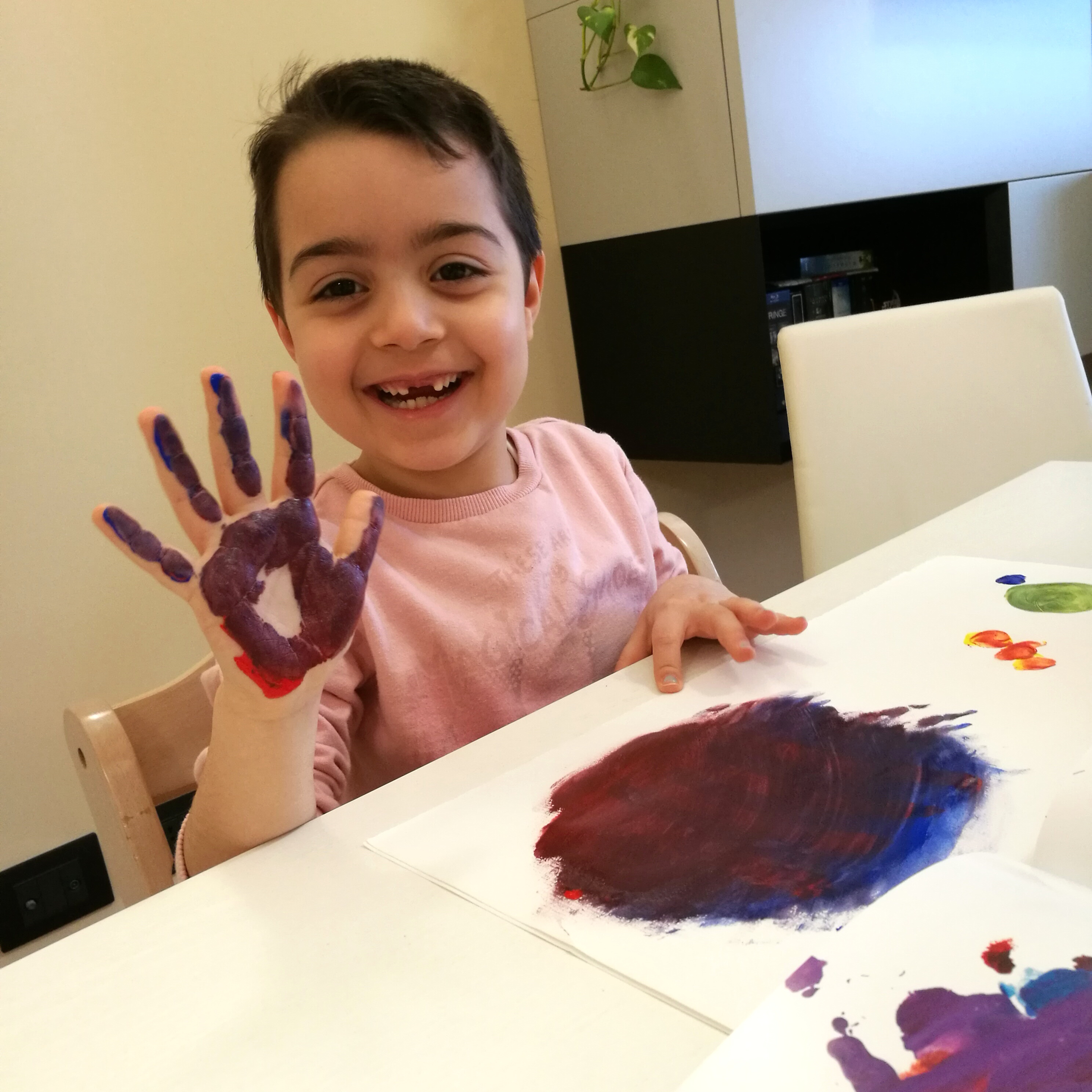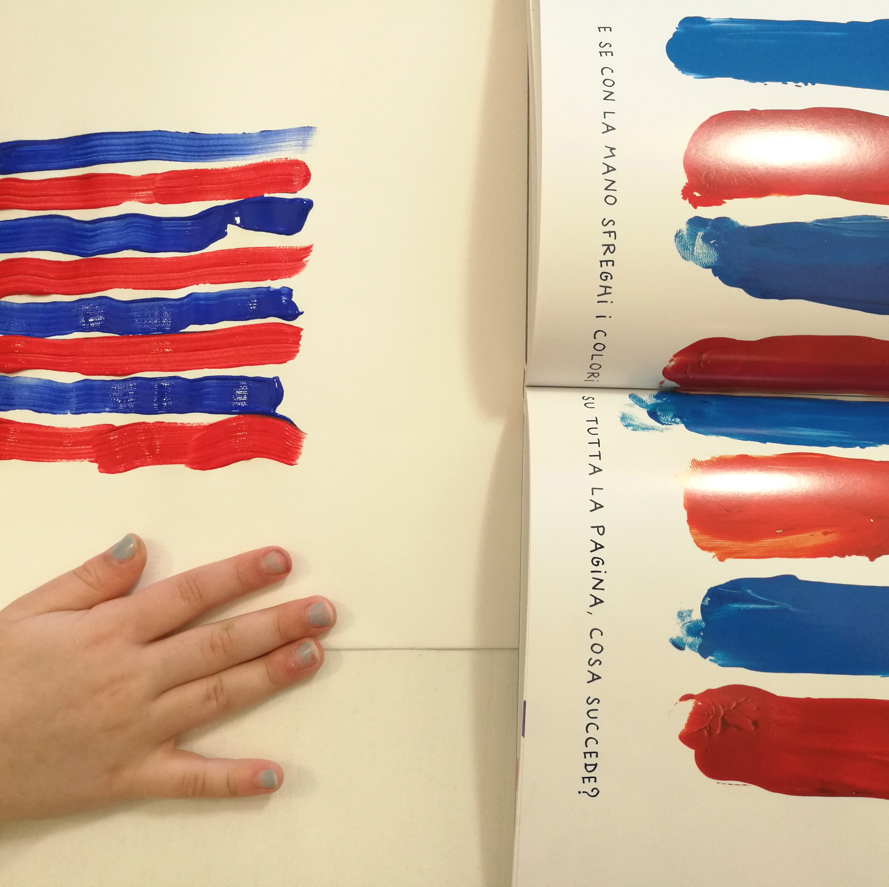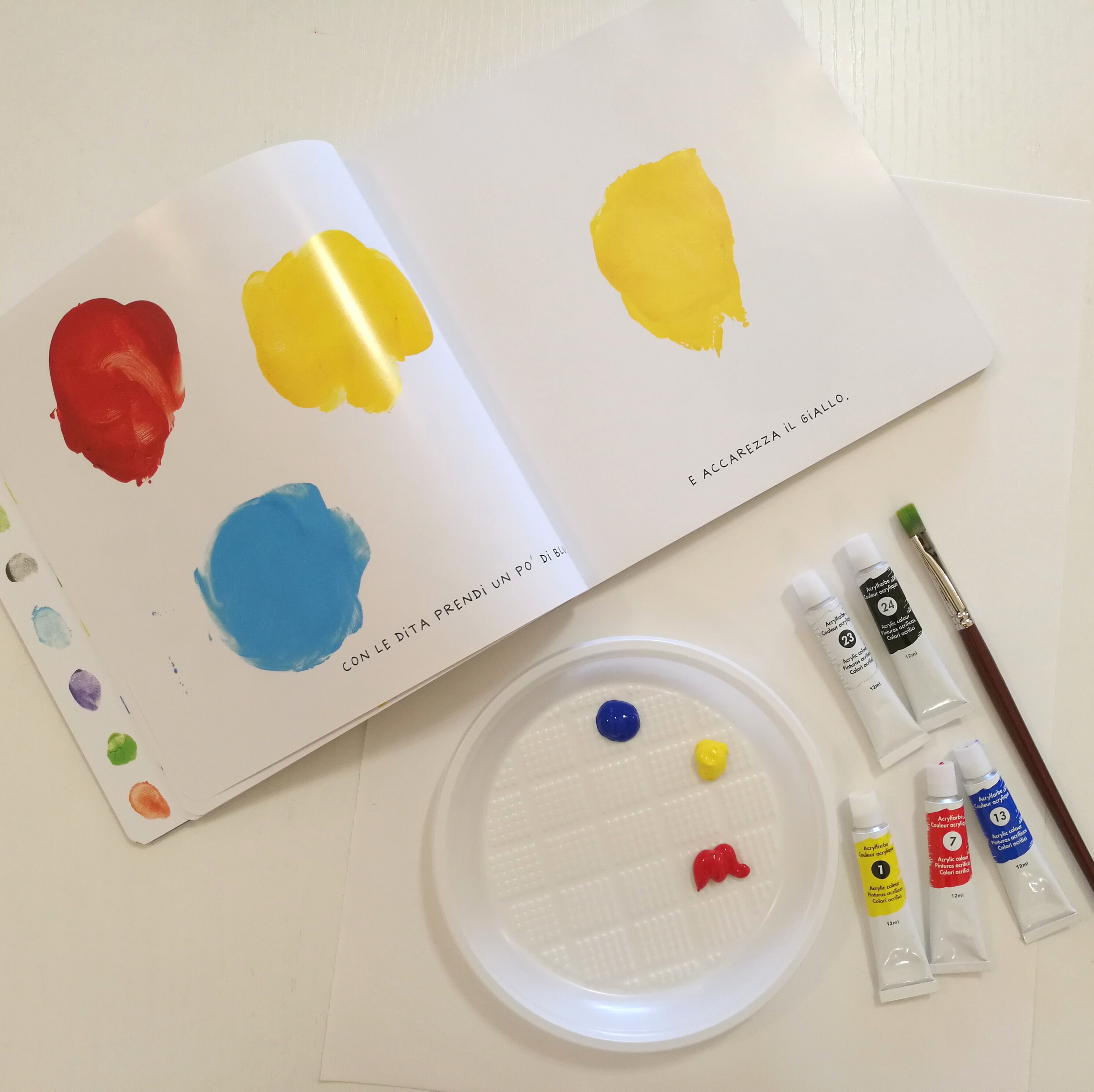 Il libro è colorato e divertentissimo e devo dire che, sebbene fossi scettica, con Matilde ha avuto un gran successo. Noi abbiamo utilizzato colori acrilici ma potete utilizzare anche i colori a dita. Come potete vedere dalla foto, oltre al libro occorrono i colori (rosso, blu, giallo, nero e bianco), un pennello o le dita e fogli di carta.
