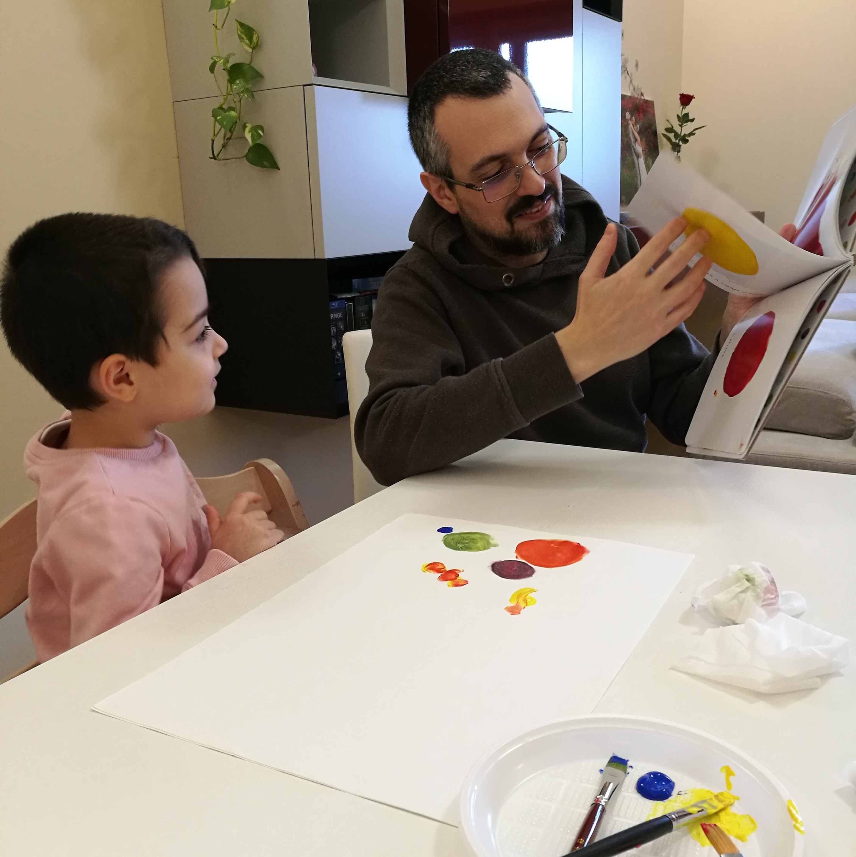 Ho svolto una piccola ricerca per presentare l’argomento “colori primari” a Matilde e mi sono imbattuta in Hervé Tullet, autore e illustratore di libri per ragazzi. Le sue opere hanno lo scopo di invitare i bambini a pensare in modo creativo. Io lo trovo spumeggiante e felice!